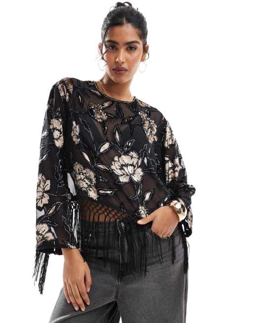 River Island floral fringe cape in black burnout