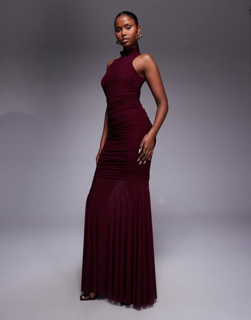 Ruched & Ready sculpting mesh high neck sleeveless ruched detailing sheer fishtail hem maxi dress in burgundy