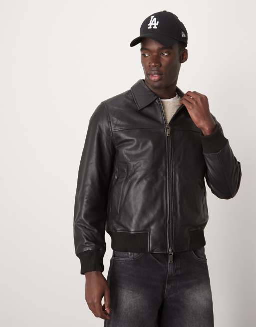 Selected collared boxy leather jacket in black