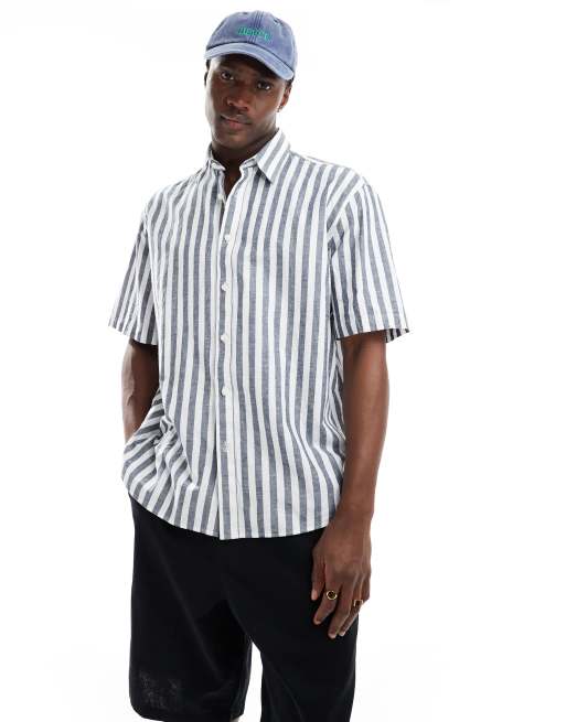 Selected oversized linen mix shirt in navy stripes