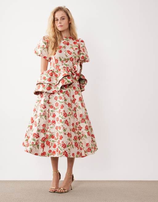 Dream Sister Jane floral jacquard puff sleeve midi dress in red