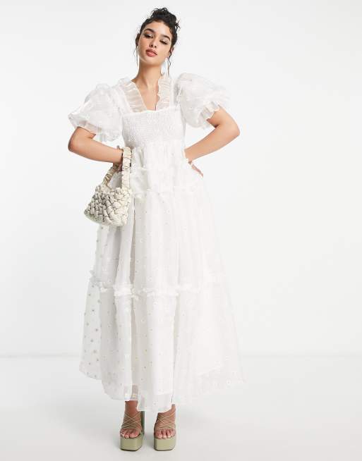 Dream Sister Jane organza puff sleeve smock dress in embroidered daisy print