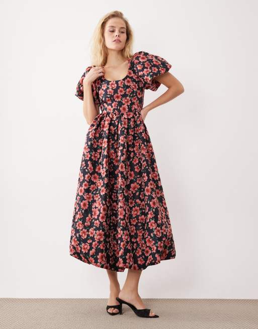 Sister Jane floral jacquard puff sleeve midi dress in navy and red