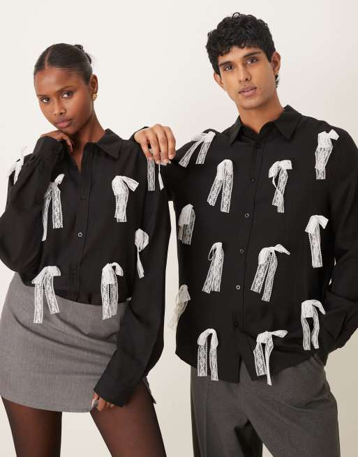 Sister Jane Unisex contrast lace bows shirt in black