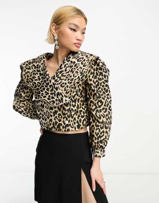 Sister Jane wrap front blouse with scalloped collar in leopard