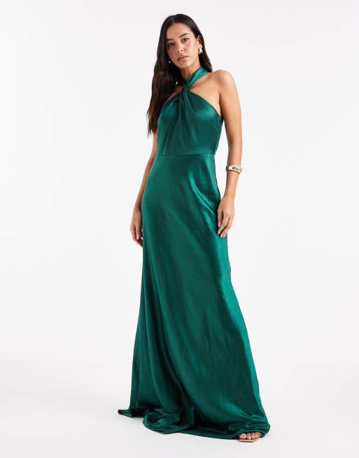 Six Stories Bridesmaid satin twist detail halterneck maxi dress in emerald green