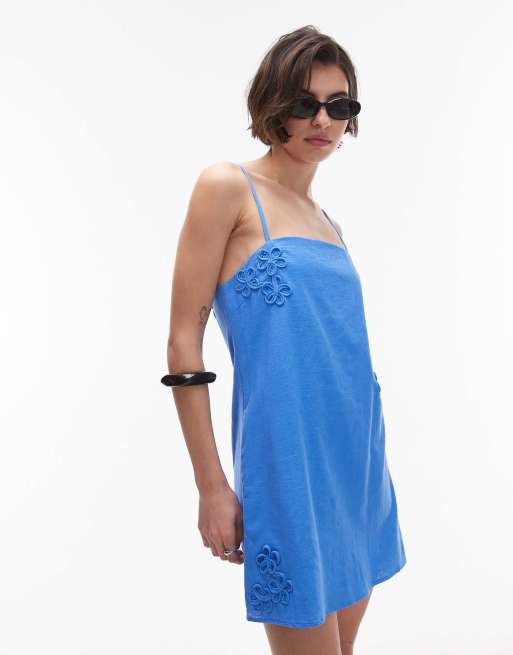 SNDYS linen blend flower applique cami strap square neck mini dress in bright blue