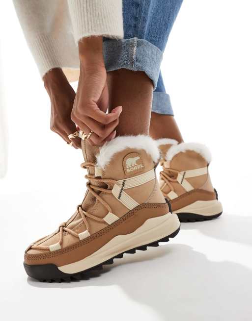 Sorel ONA RMX Glacy Plus WP waterproof fleece lined suede snow boots in canoe and sea salt