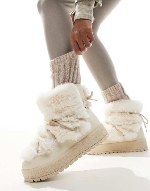 South Beach Faux Fur Lace Up Ankle Boots in Cream