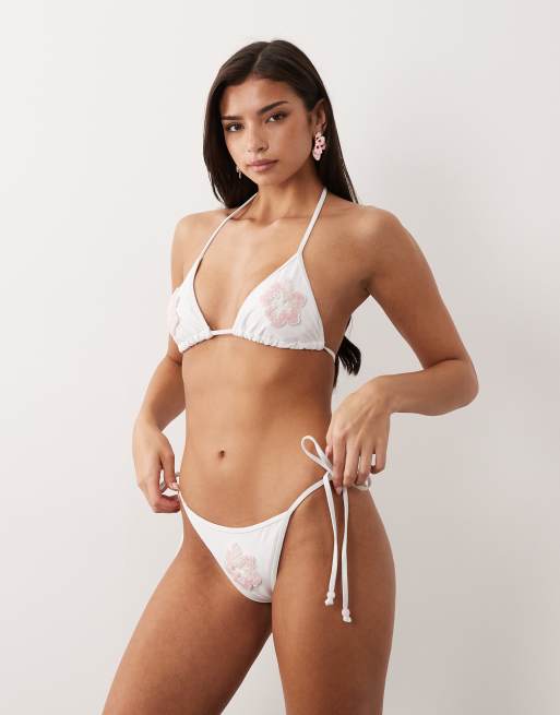 South Beach tie side bikini bottoms with sequin flower patch in white