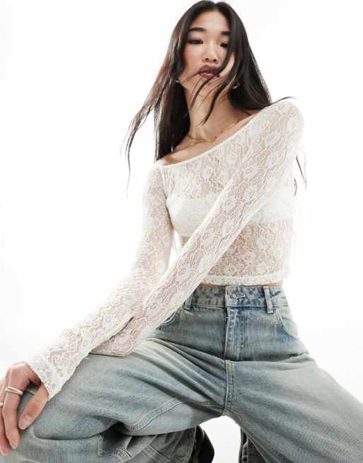 Stradivarius off shoulder lace detail long sleeve top in ecru