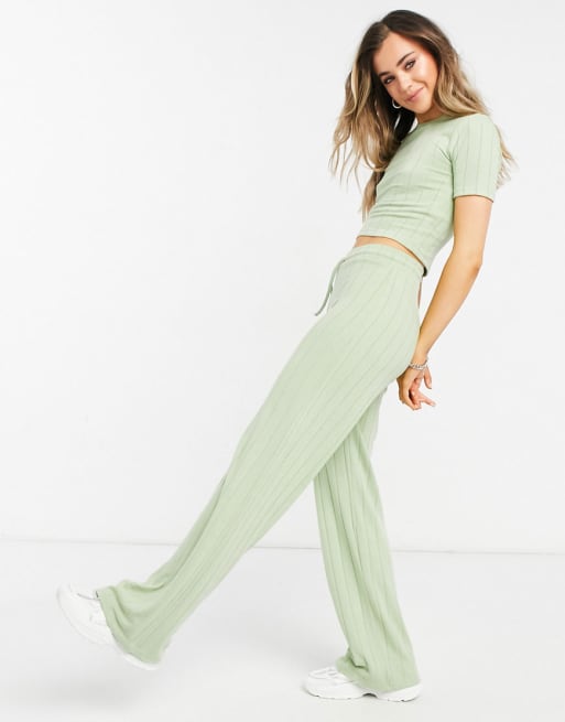 Stradivarius recycled polyester ribbed T-shirt and pants set in sage green