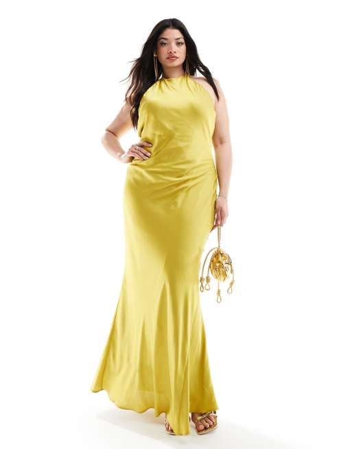TFNC Bridesmaids Plus satin maxi dress with tie back and button detail in lime