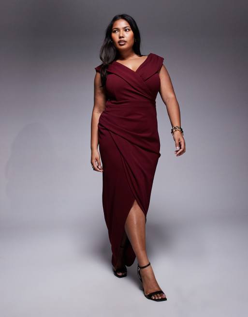 TFNC Plus wrap detail bardot midaxi dress in wine