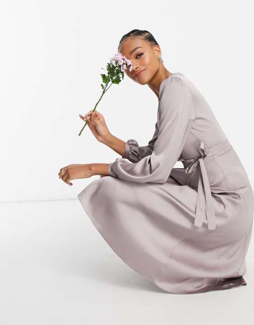 TFNC bridesmaid satin long sleeve wrap front midi dress in gray