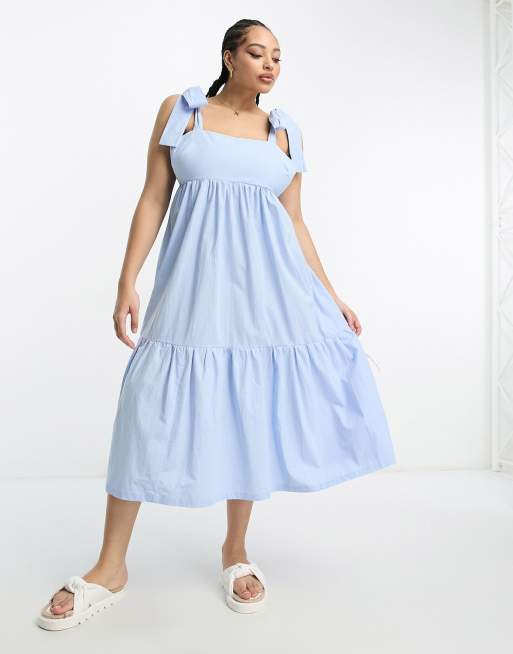 The Frolic Plus tiered midi dress with tie straps in blue poplin