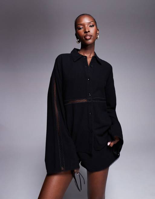 The Frolic exclusive linen blend lace trim button front shirt in black - part of a set