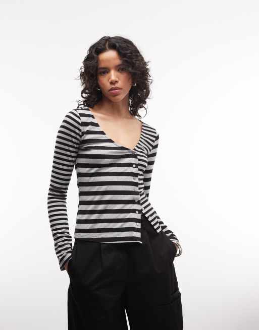 The Ragged Priest asymmetric button down long sleeve top in gray and black mixed stripes