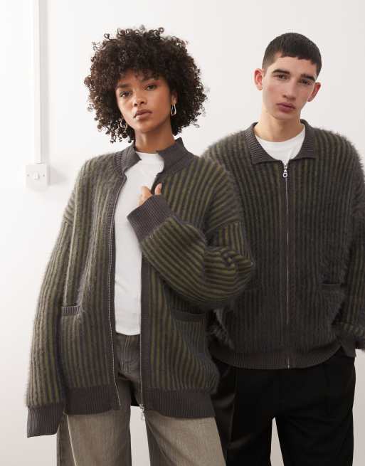 The Ragged Priest Unisex fuzzy ribbed zip up cardigan in green