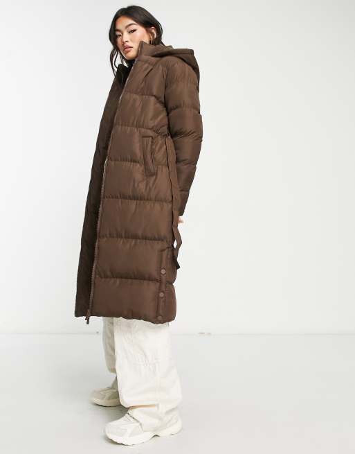 Threadbare Addison maxi belted puffer coat in chocolate brown