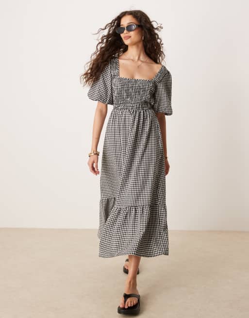 Threadbare gingham milkmaid midi dress with shirred bust in black and white