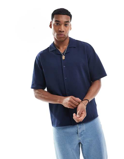 Threadbare seersucker short sleeve revere collar shirt in navy