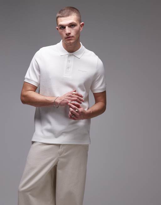 Tommy Jeans script logo waffle knit polo shirt in off white