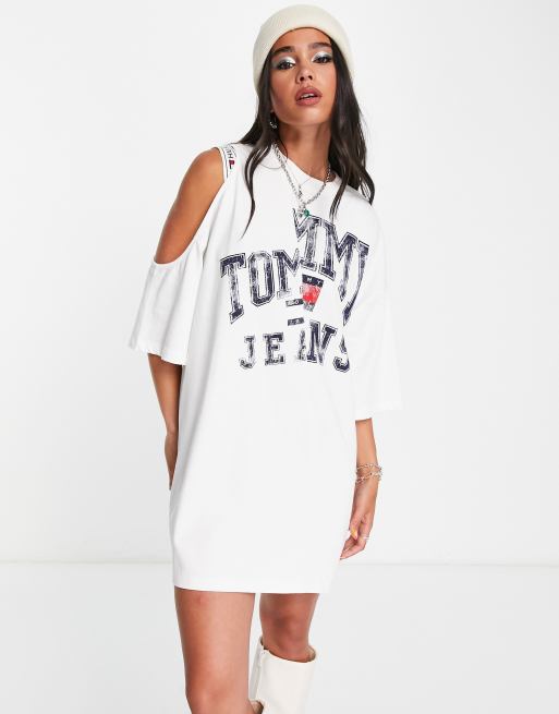 Tommy Jeans x ASOS exclusive varsity logo cold shoulder t-shirt dress in white