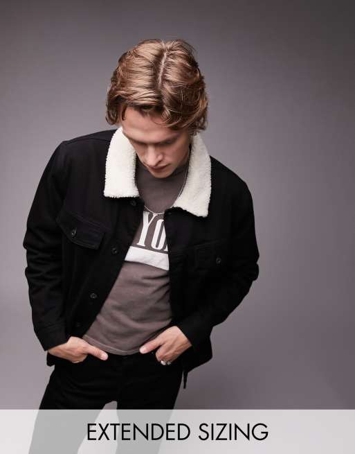 Topman borg collar denim jacket in black