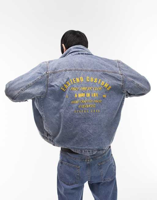 Topman borg collar denim jacket with embroidery in mid wash blue