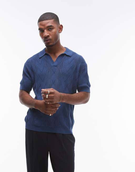 Topman knit diamond pattern pointelle polo in navy