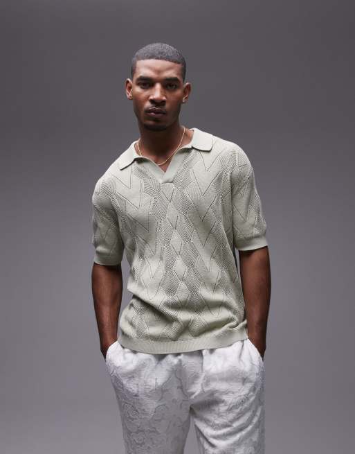 Topman knit diamond pattern pointelle polo shirt in light green