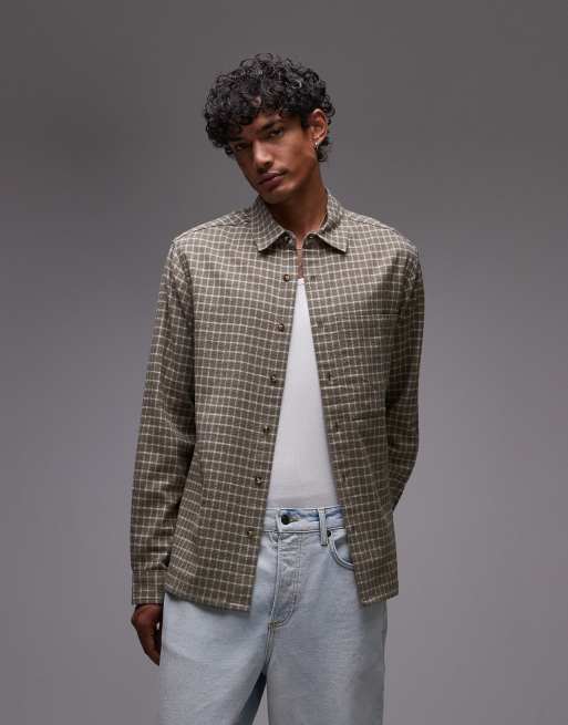 Topman long sleeve relaxed grid plaid shirt in khaki