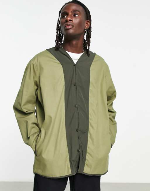 Topman long sleeve supreme oversized collarless overshirt with back design in khaki