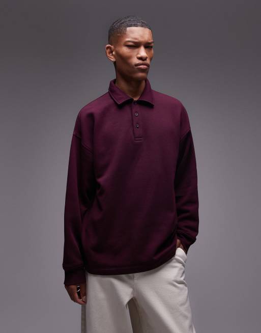 Topman oversized long sleeve sweatshirt fabric polo shirt in burgundy