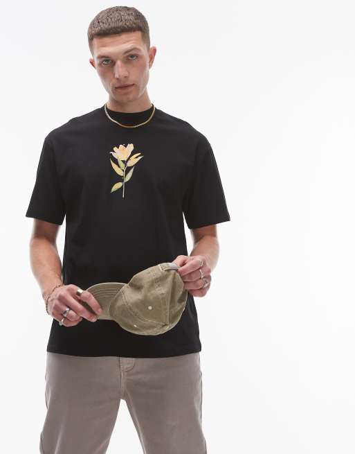 Topman premium relaxed fit t-shirt with front and back pressed lily prints in black