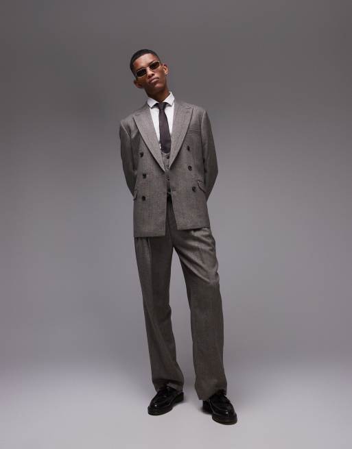 Topman premium wide leg wool mix striped herringbone suit pants in brown