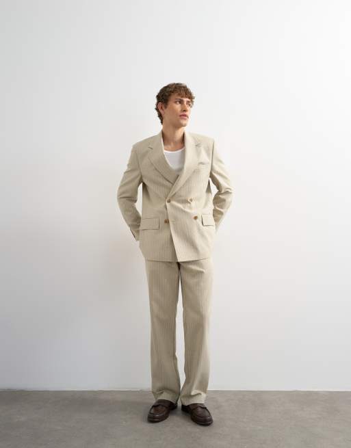 Topman relaxed double breasted stripe blazer in stone