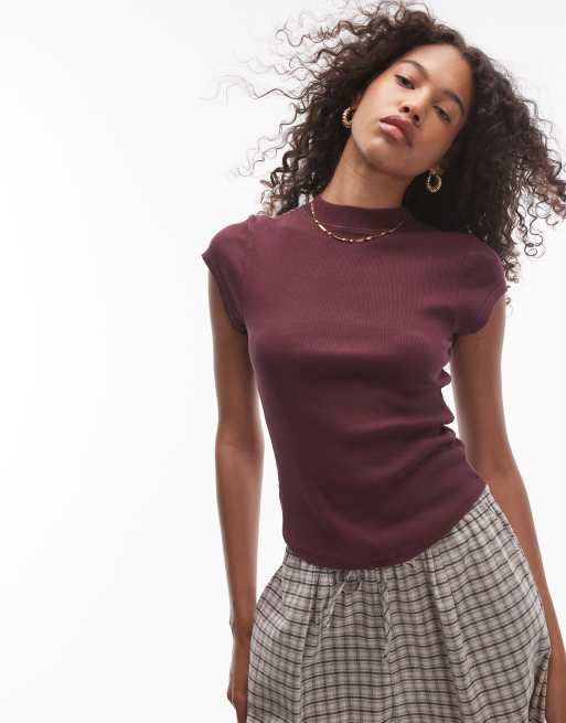 Topshop acid wash rib knit curved hem fitted tee in burgundy