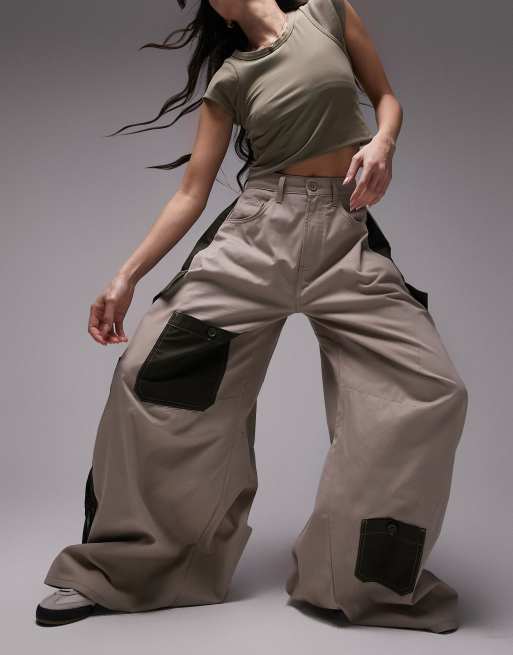 Topshop baggy patchwork cargo pants in khaki