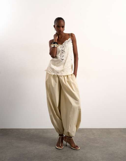 Topshop crinkle satin top with lace inserts in ivory