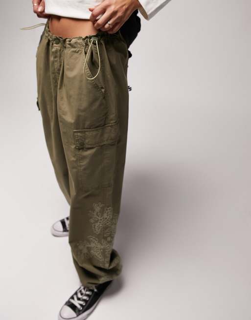 Topshop embroidered parachute balloon low rise cargo pants in khaki
