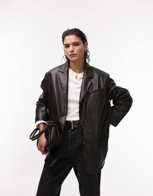 Topshop faux leather oversized blazer jacket in chocolate