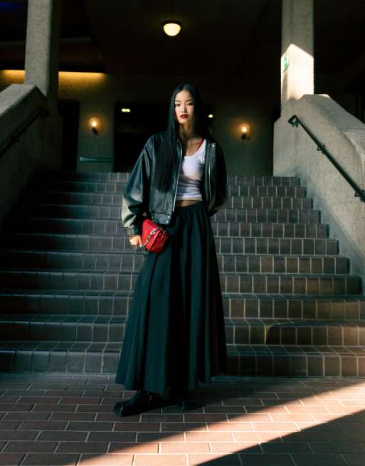 Topshop faux leather oversized pocket collar bomber jacket in black