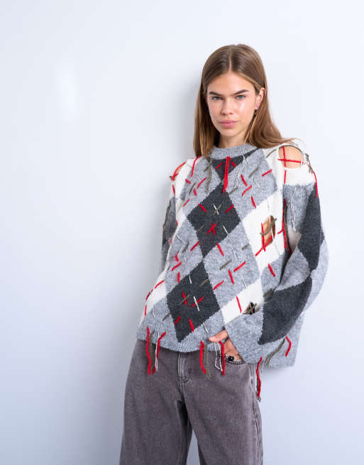 This sweater is crafted using a mid-weight knit in an argyle pattern. It features a classic crew neck, exposed stitching and a cut-out, distressed finish. It has a loose, relaxed fit.Product Code: 145951406