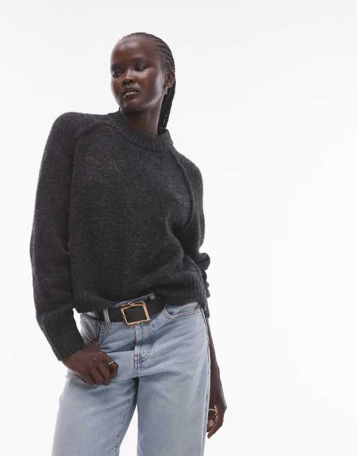 Topshop knitted crew with raglan and exposed seam sweater in charcoal