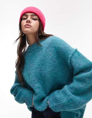 Topshop knitted longline exposed seam fluffy crew neck sweater in teal