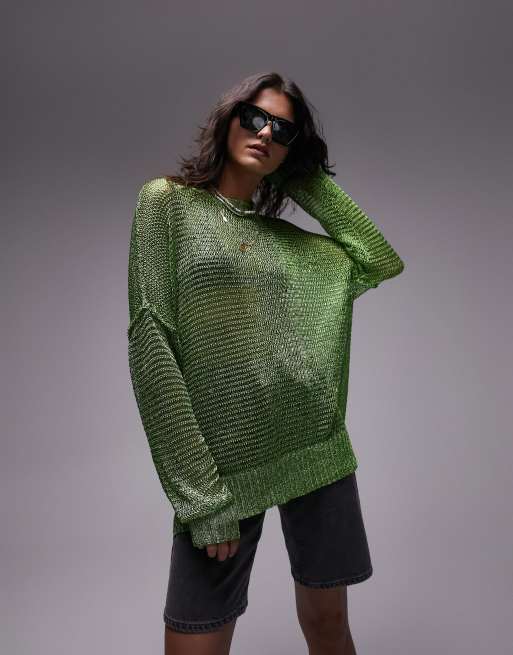 Topshop knitted open metallic oversized sweater in green