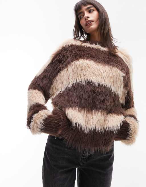 Topshop knitted ultra fluffy stripe crew sweater in neutral