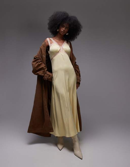 Topshop lace insert midi dress with pleated bust in lemon and peach